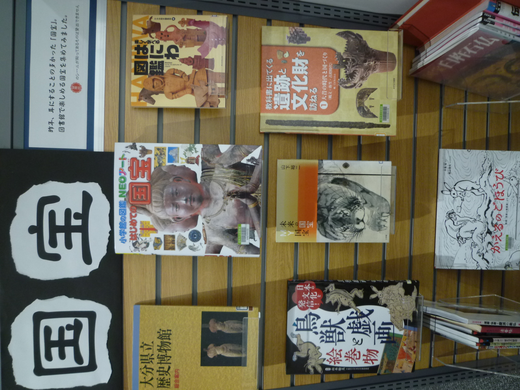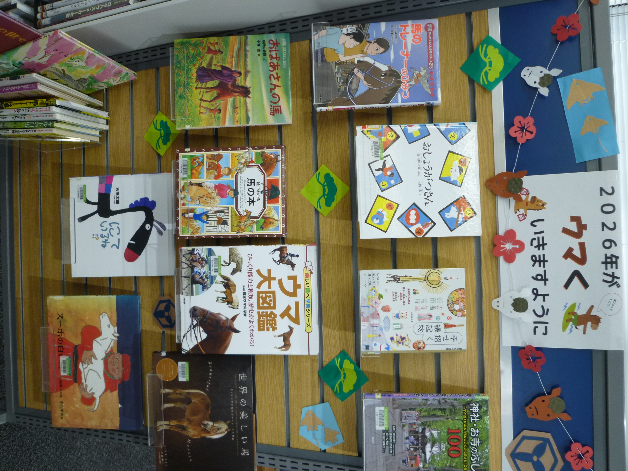 昨年耳にすることの多かった「国宝」。図書館で楽しめる国宝や、今年の干支である午(うま)にちなんだ本を集めて展示しています。